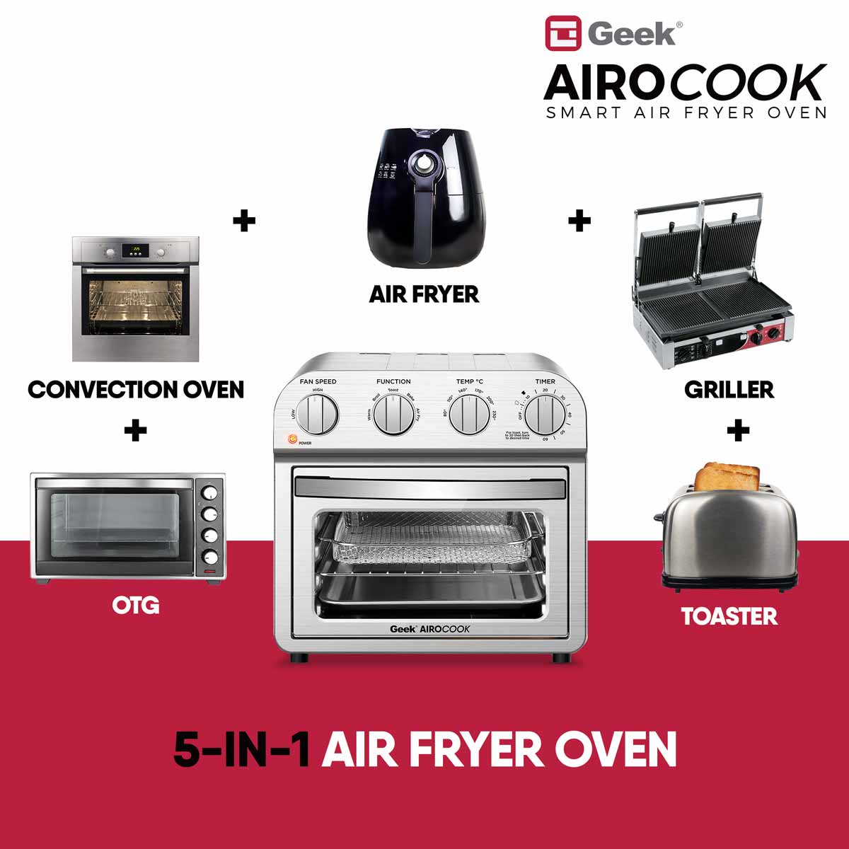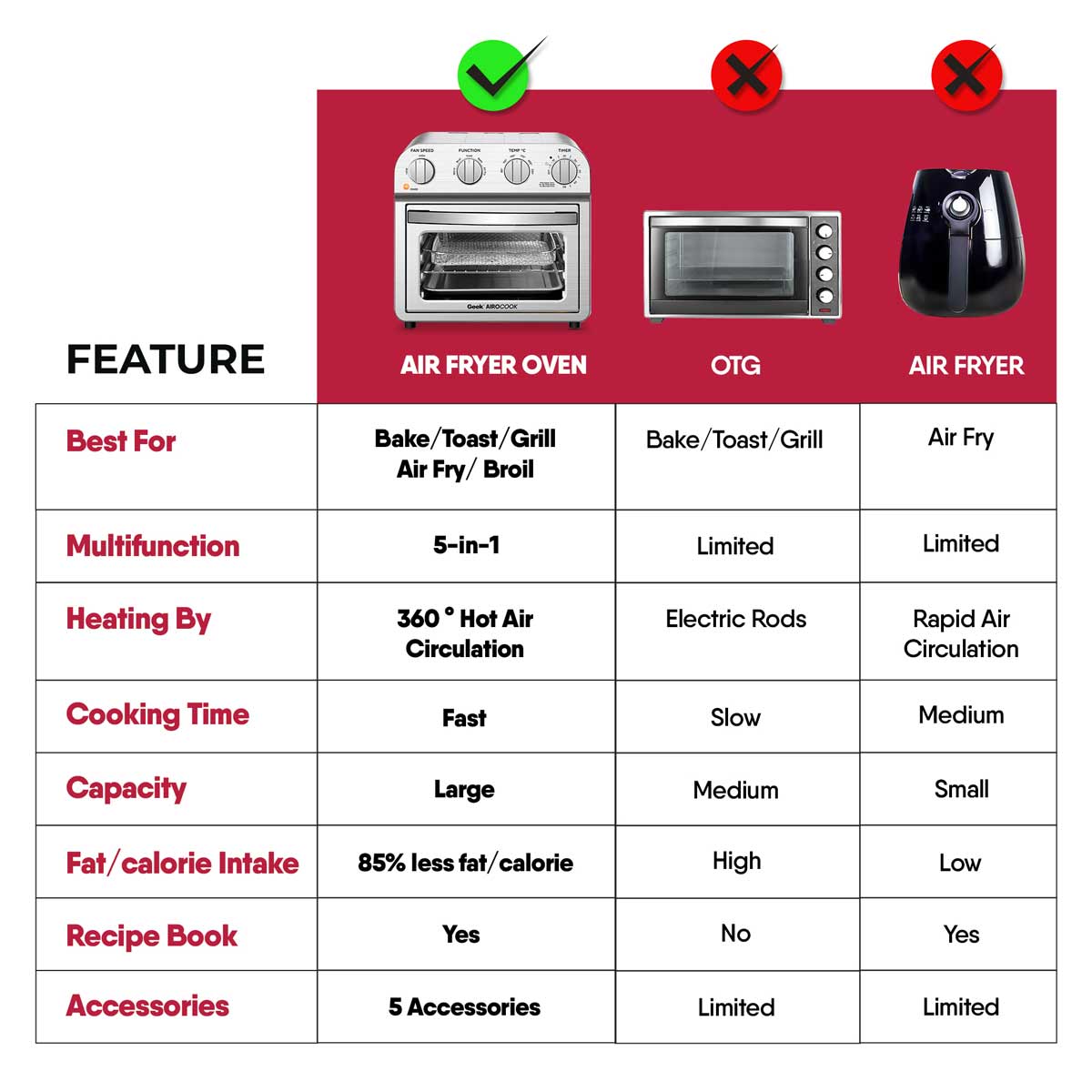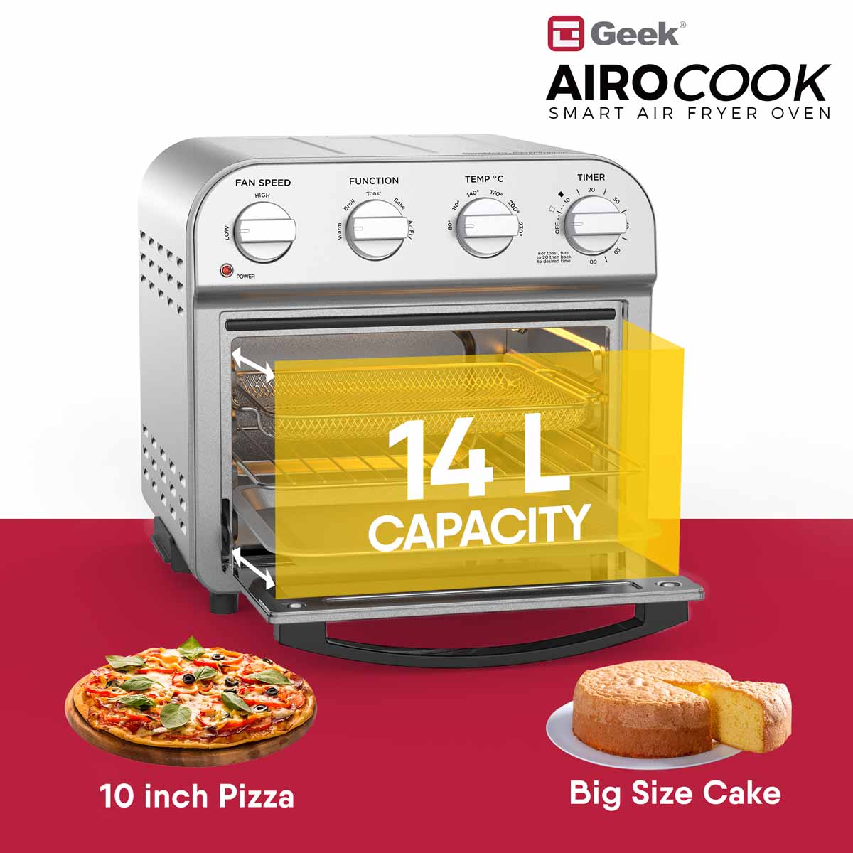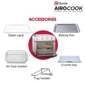 Now bake and air fry your favourites with 85% less fat and oil free with Geek AiroCook Acis Smart Air fryer oven. Featured with 360 degree hot air circulation technology, the air fryer oven help you achieve crispy food in no time by distributing heat in all directions. The 14L Oven Toaster griller gives you the advantage of cooking for a family at once. Make cake, chicken, pizza, steak, cookie, fries, kebabs, veg skewers- all in one Air fryer Oven.