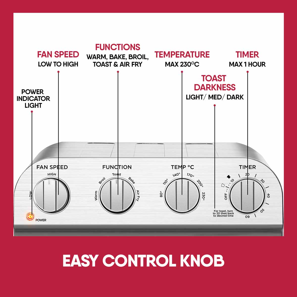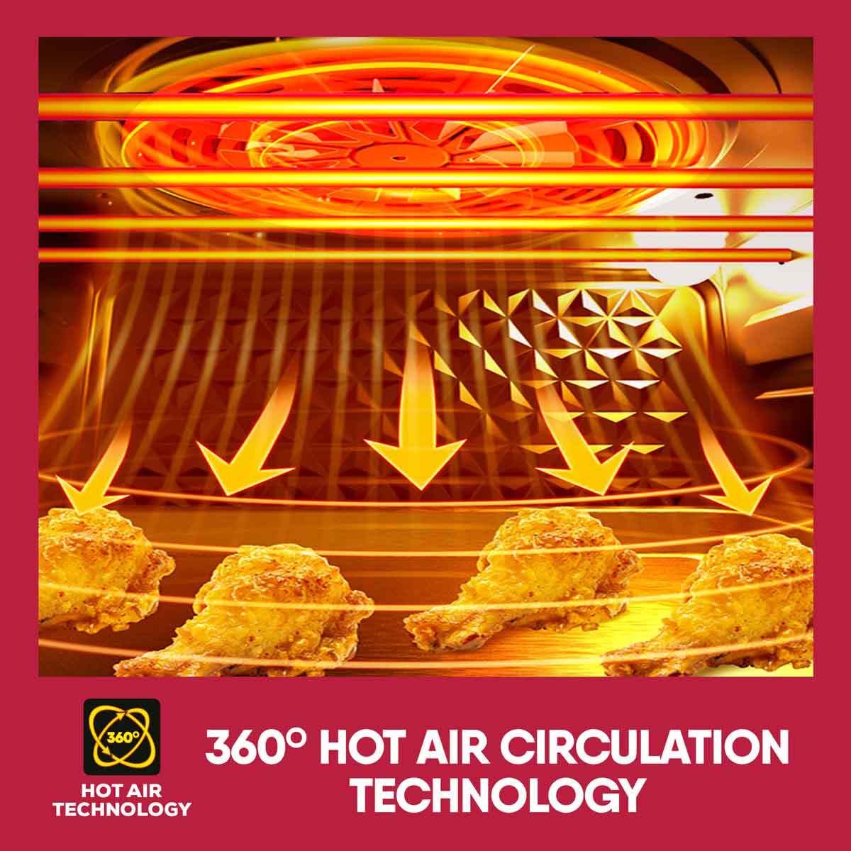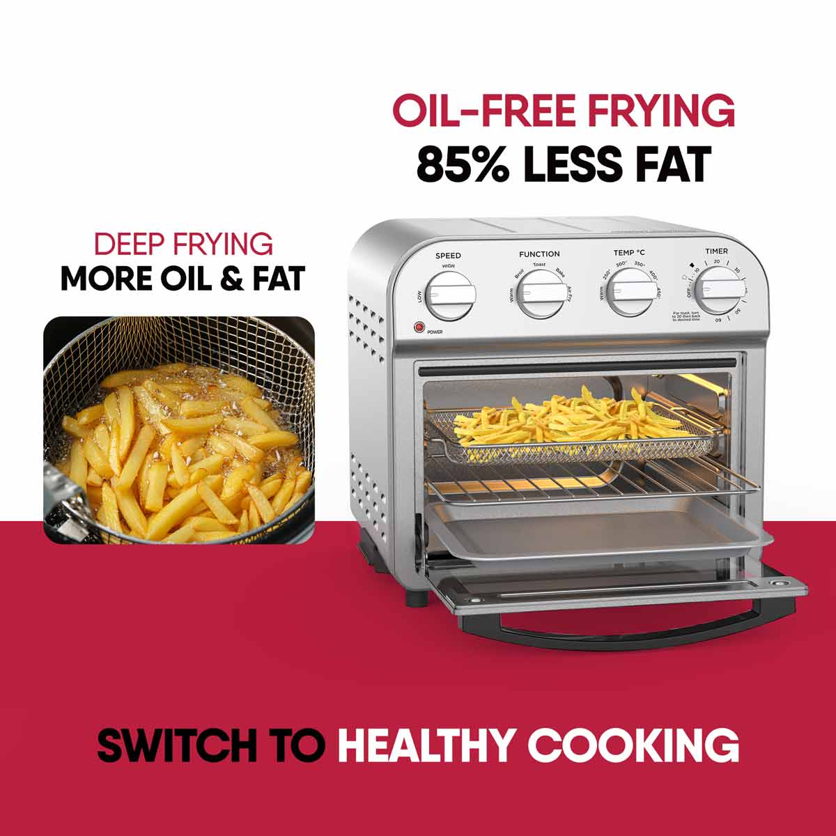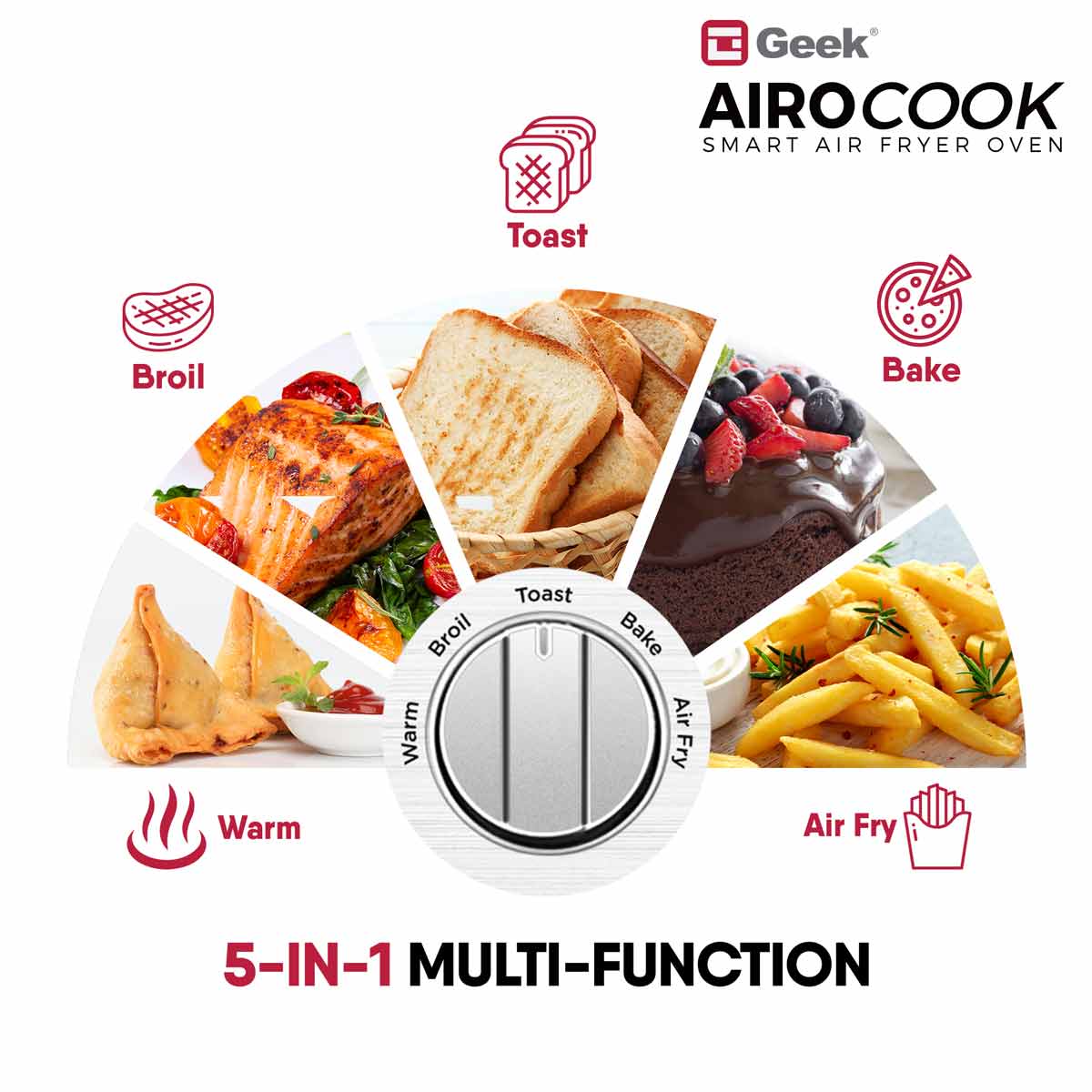 Now bake and air fry your favourites with 85% less fat and oil free with Geek AiroCook Acis Smart Air fryer oven. Featured with 360 degree hot air circulation technology, the air fryer oven help you achieve crispy food in no time by distributing heat in all directions. The 14L Oven Toaster griller gives you the advantage of cooking for a family at once. Make cake, chicken, pizza, steak, cookie, fries, kebabs, veg skewers- all in one Air fryer Oven.