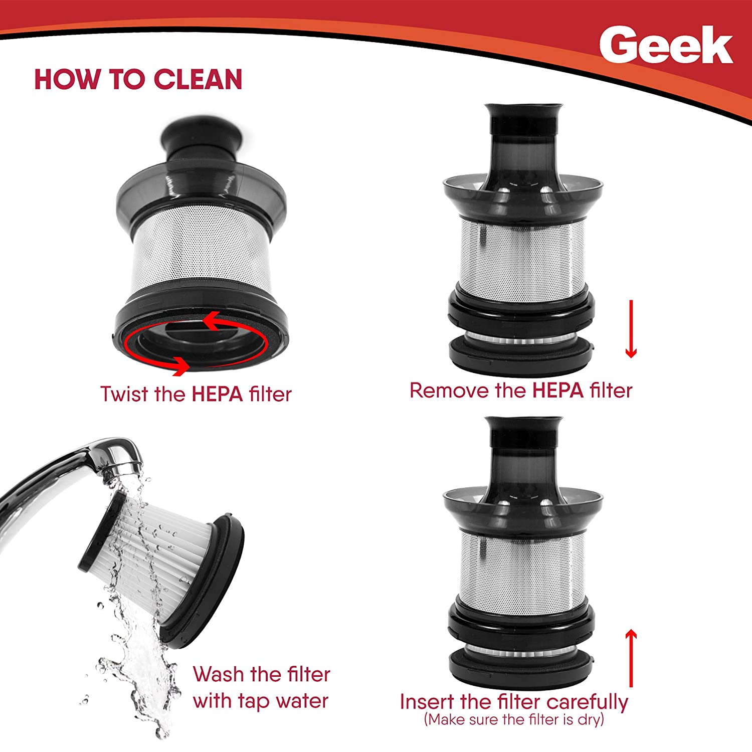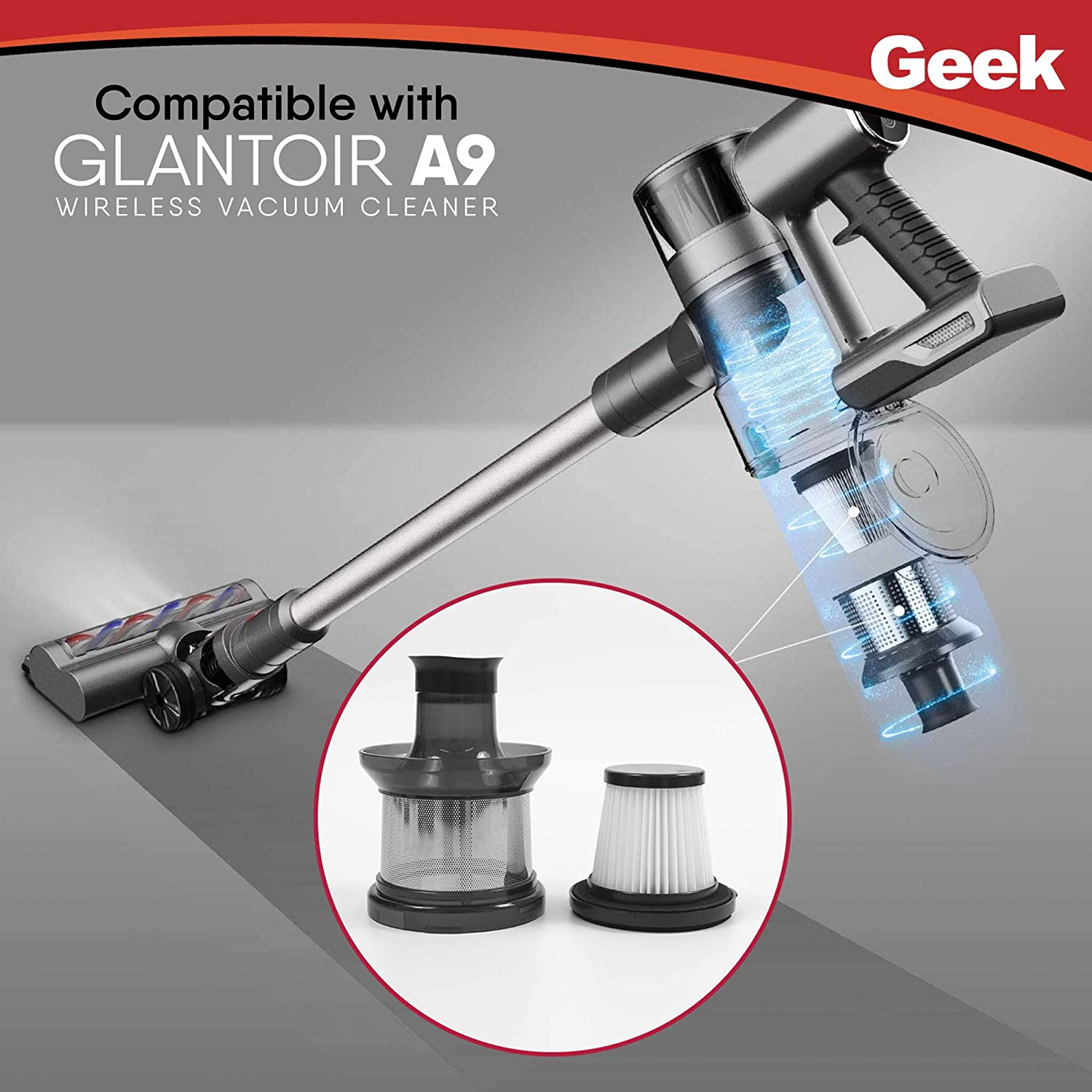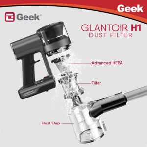 Glantoir H1 dust filter is easy to install and remove. Exclusively compatible for Geek Glantoir A9 wireless vacuum cleaner. The HEPA filter prevents dust from entering the motor and helps in better functioning. Just rotate the clamp clockwise and pull the HEPA filter to remove. The best practice is to wash the filter with tap water and dry it completely before use. Please ensure to replace the filter once it gets torn or clogged up for best performance of the vacuum.