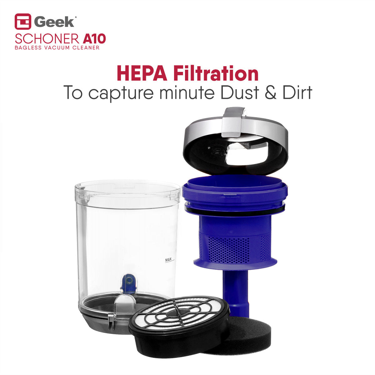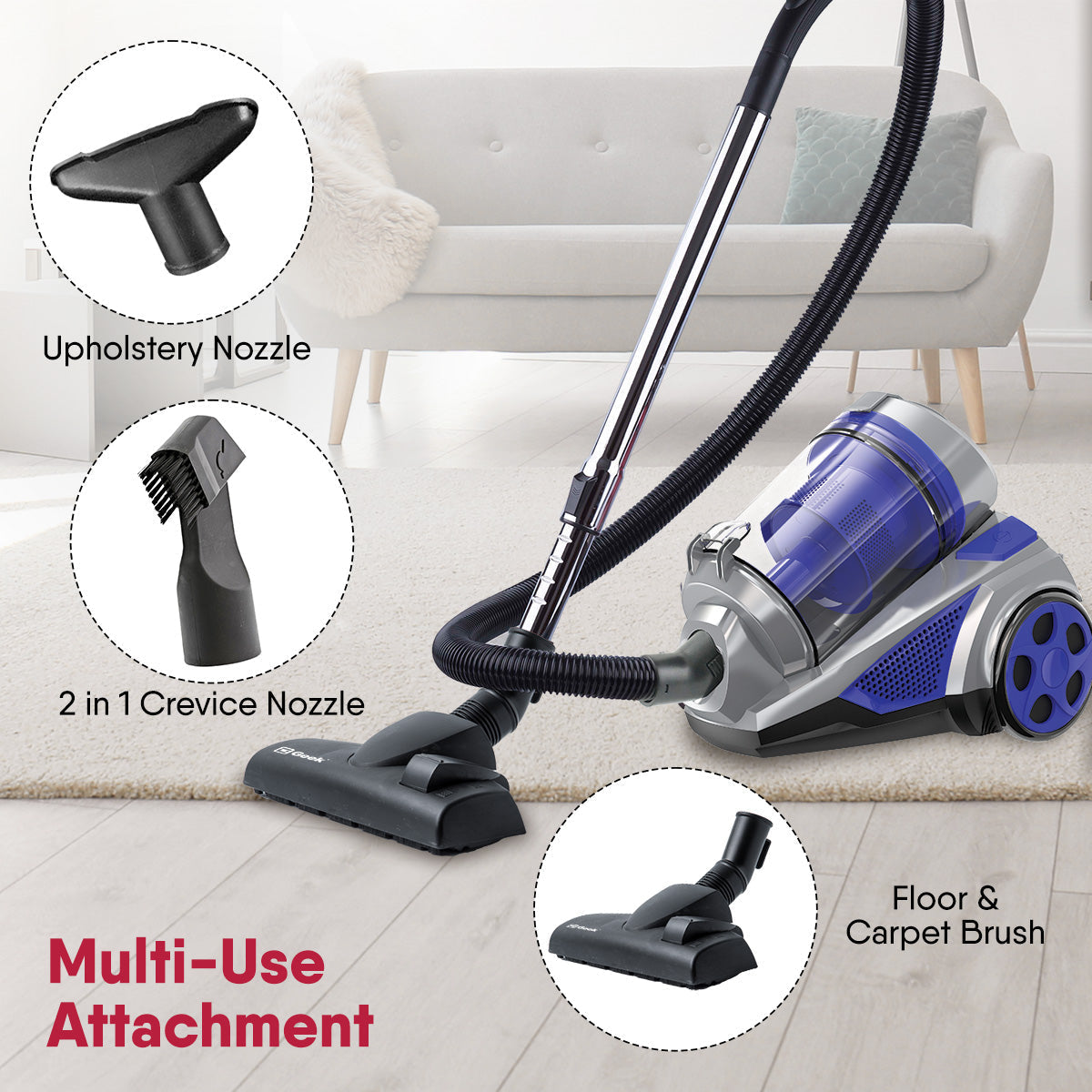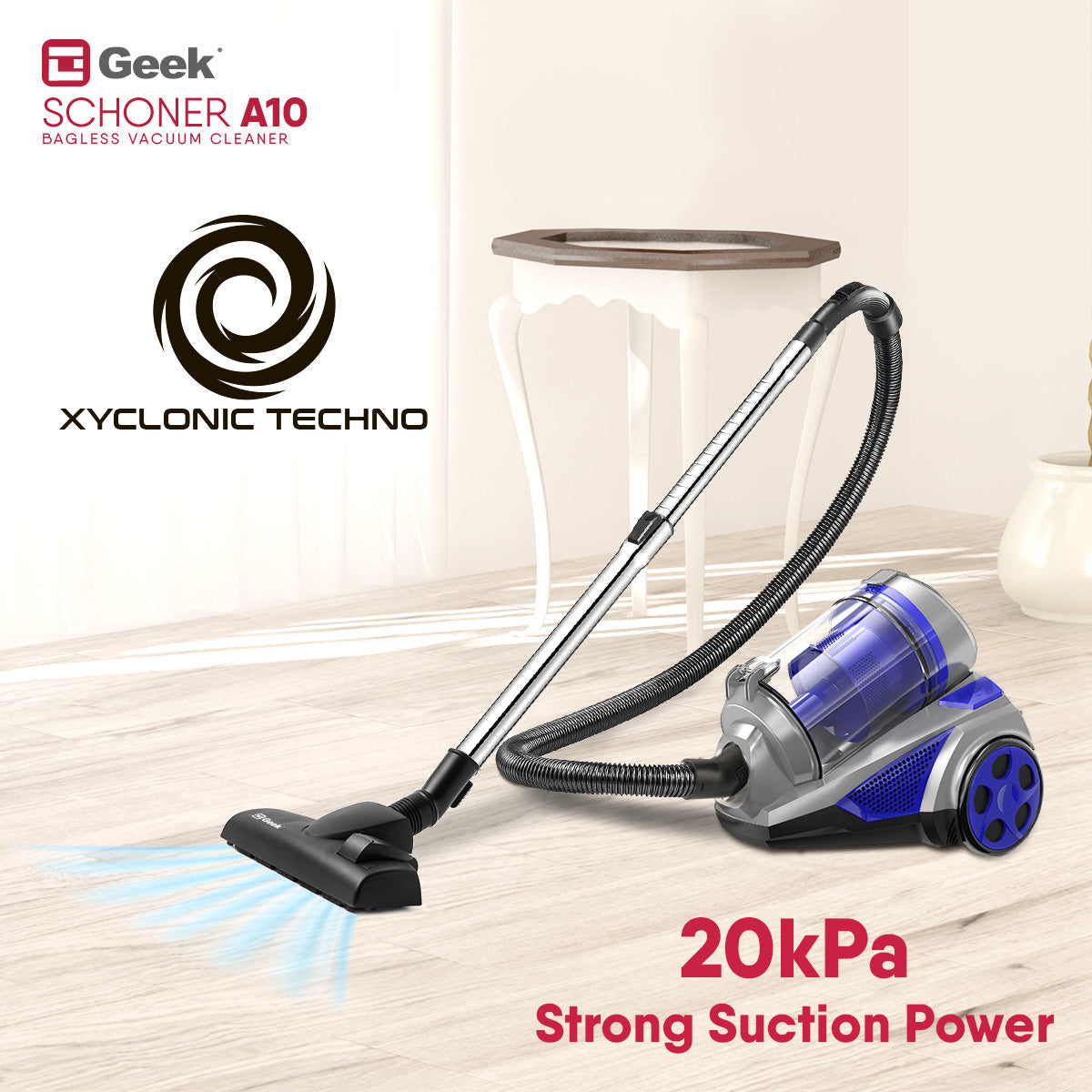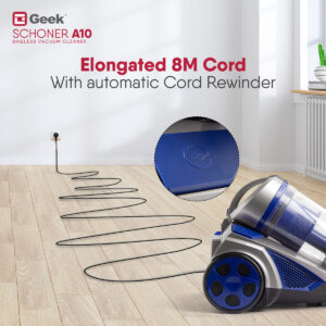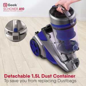 GEEK range of vacuum cleaners is engineered with high quality and unparalleled performance. Geek Schoner A10 wired vacuum cleaner comes with a 1400W powerful motor that has strong suction of 20kPa. With detachable 1.5L dust box capacity, the bagless vacuum saves you from disposing of dust frequently and changing dust bags. In company with the multipurpose attachments – 2 in 1 crevice nozzle, Floor & carpet brush, and an upholstery nozzle, cleaning will no more be tedious.