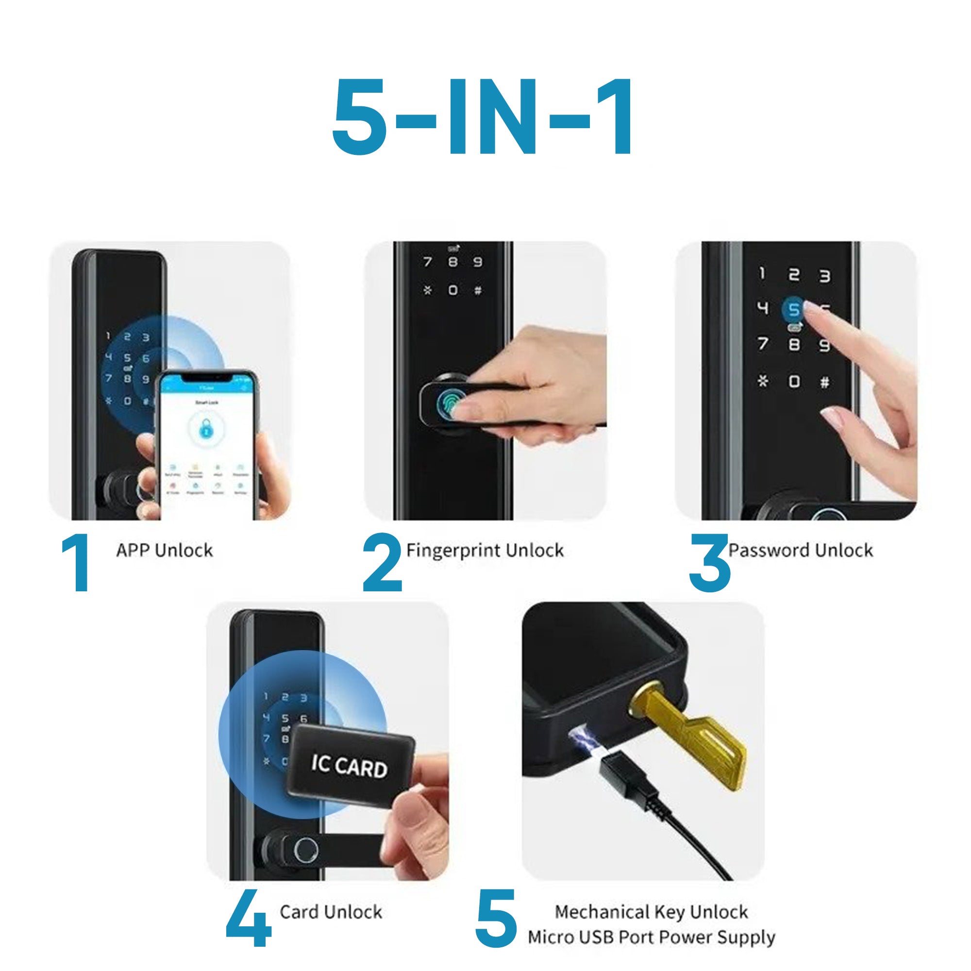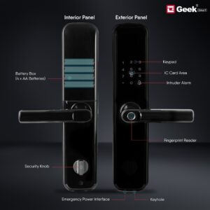 5-IN-1 UNLOCKING: Geek X403 smart digital door lock comes with the 5 unique and quick unlock modes. Fingerprint access unlocking, Mobile App control, OTP access, Integrated Chip(IC) card access, and also with emergency back-up of mechanical keys.