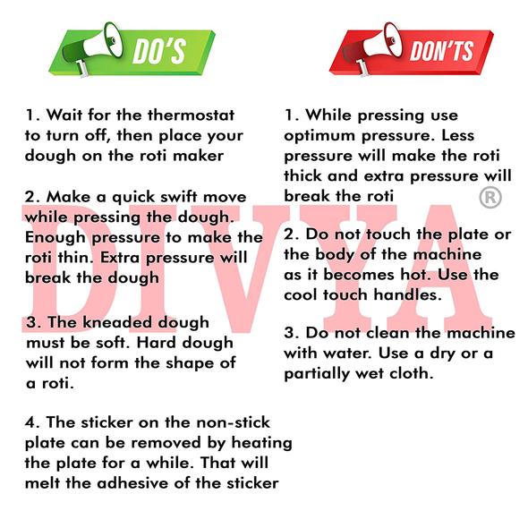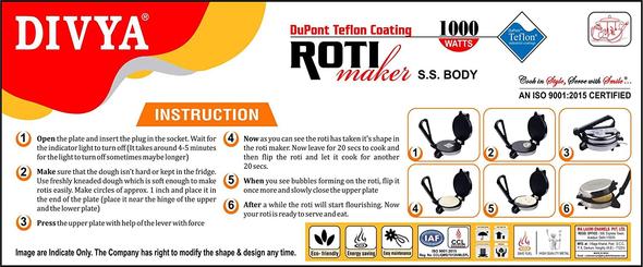 - Quality: Automatic DIVYA Roti/Khakhra/Paratha Maker has the best standard of Stainless Steel along with Teflon American Heritage NonStick Coating on the Tawa. It gives you the best performance with it 1000 Watts capacity