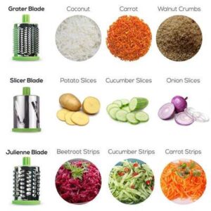 - Make juliennes, grate, shred and slice carrots, raw banana, potatoes, radish, cheese, zucchini, fruits and more within seconds!